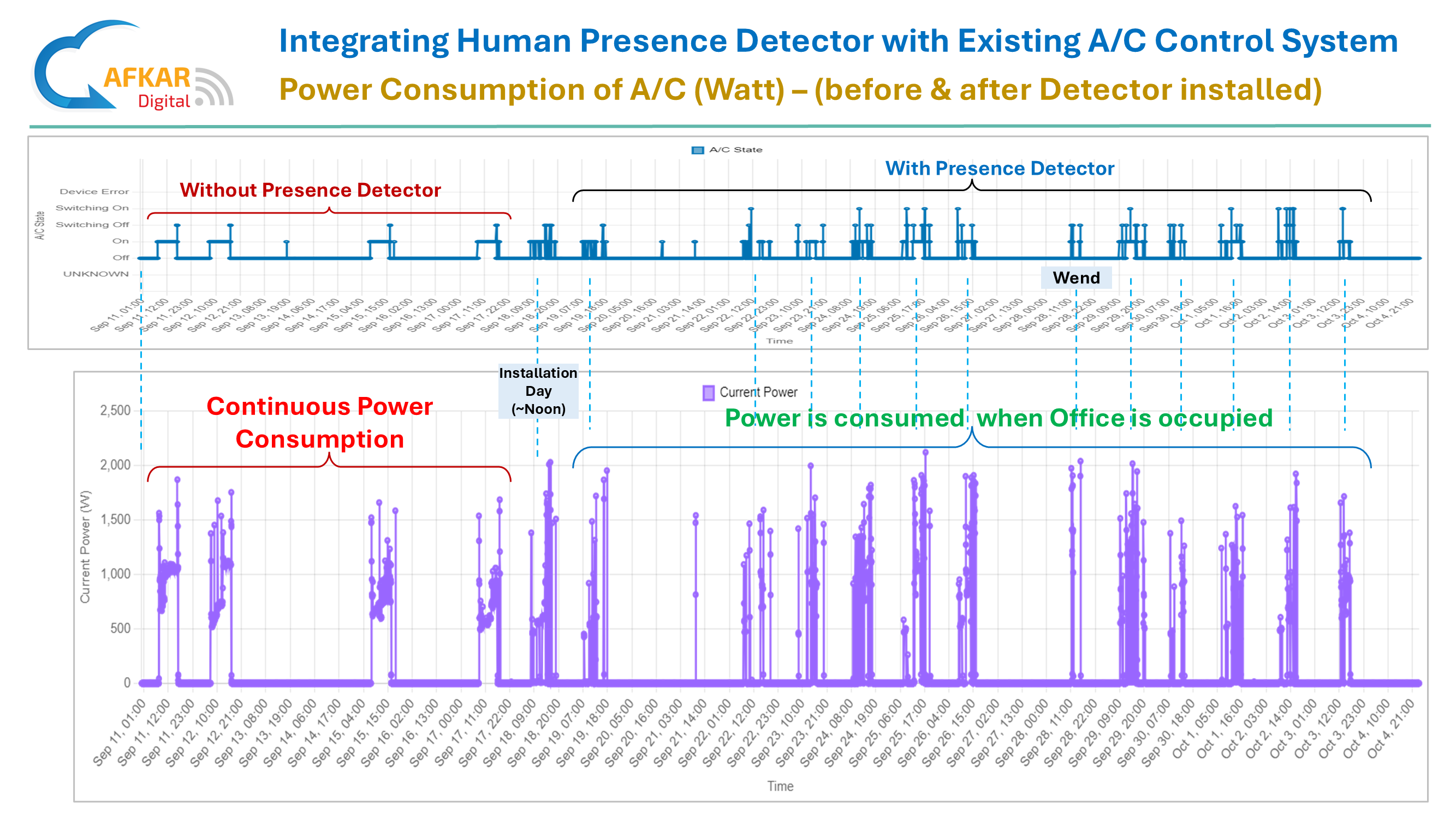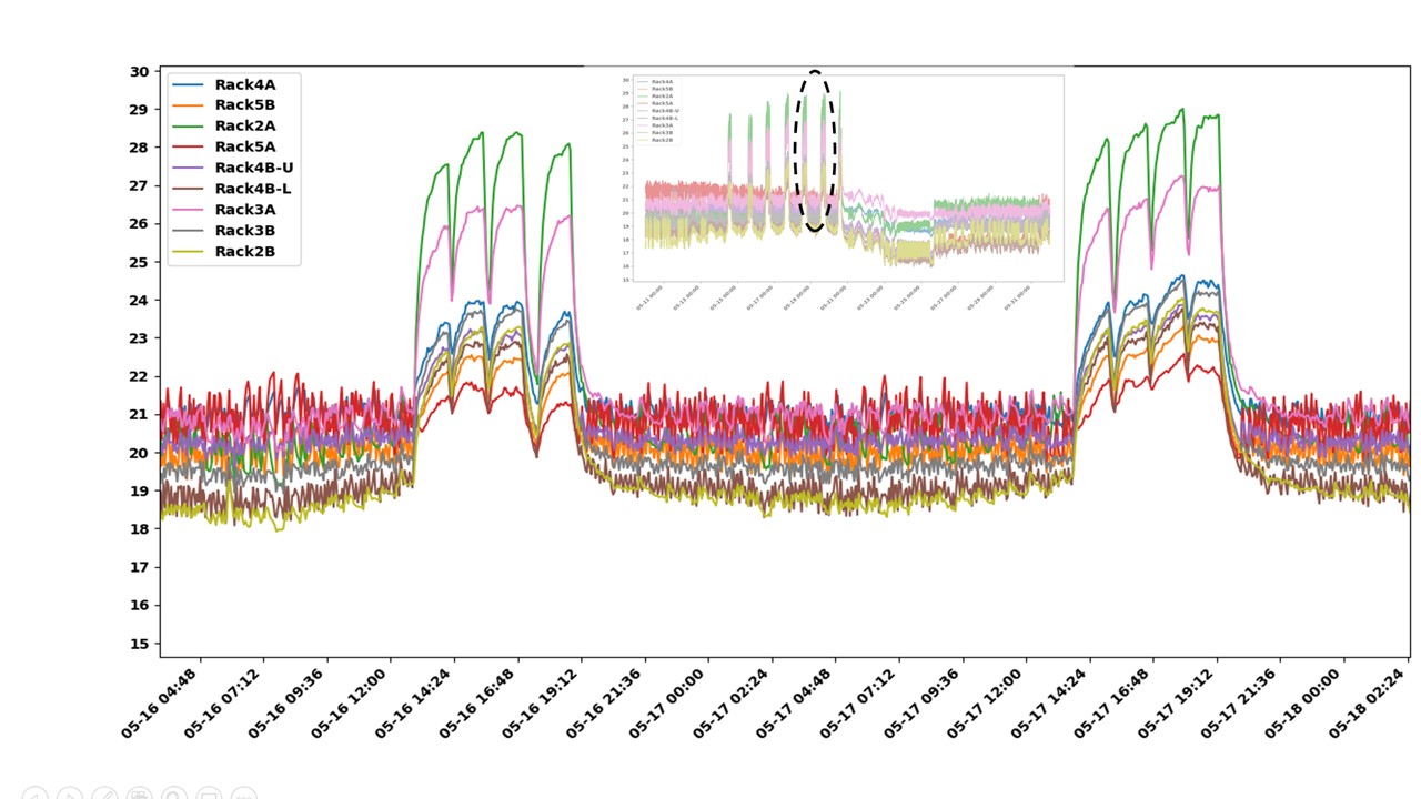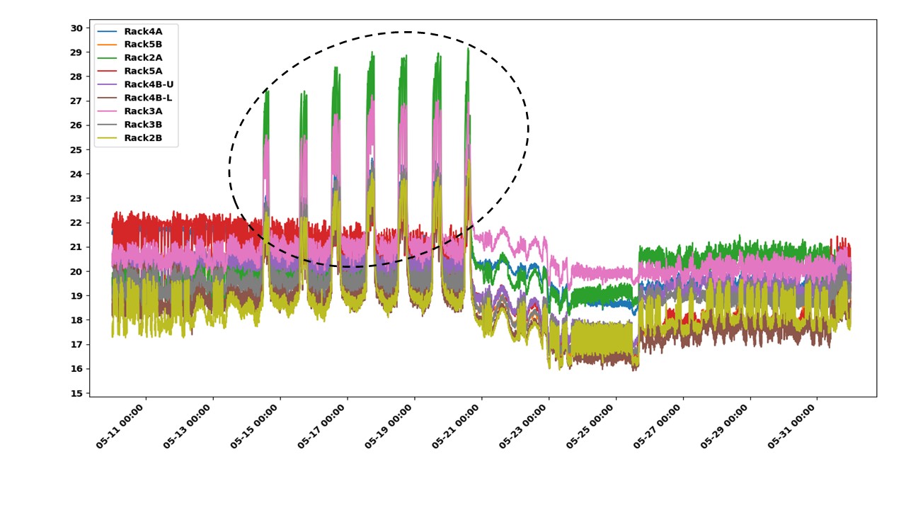 This temperature pattern appeared during hot summer and revealed the reduced efficiency of AC Split Units in a Data Center room.