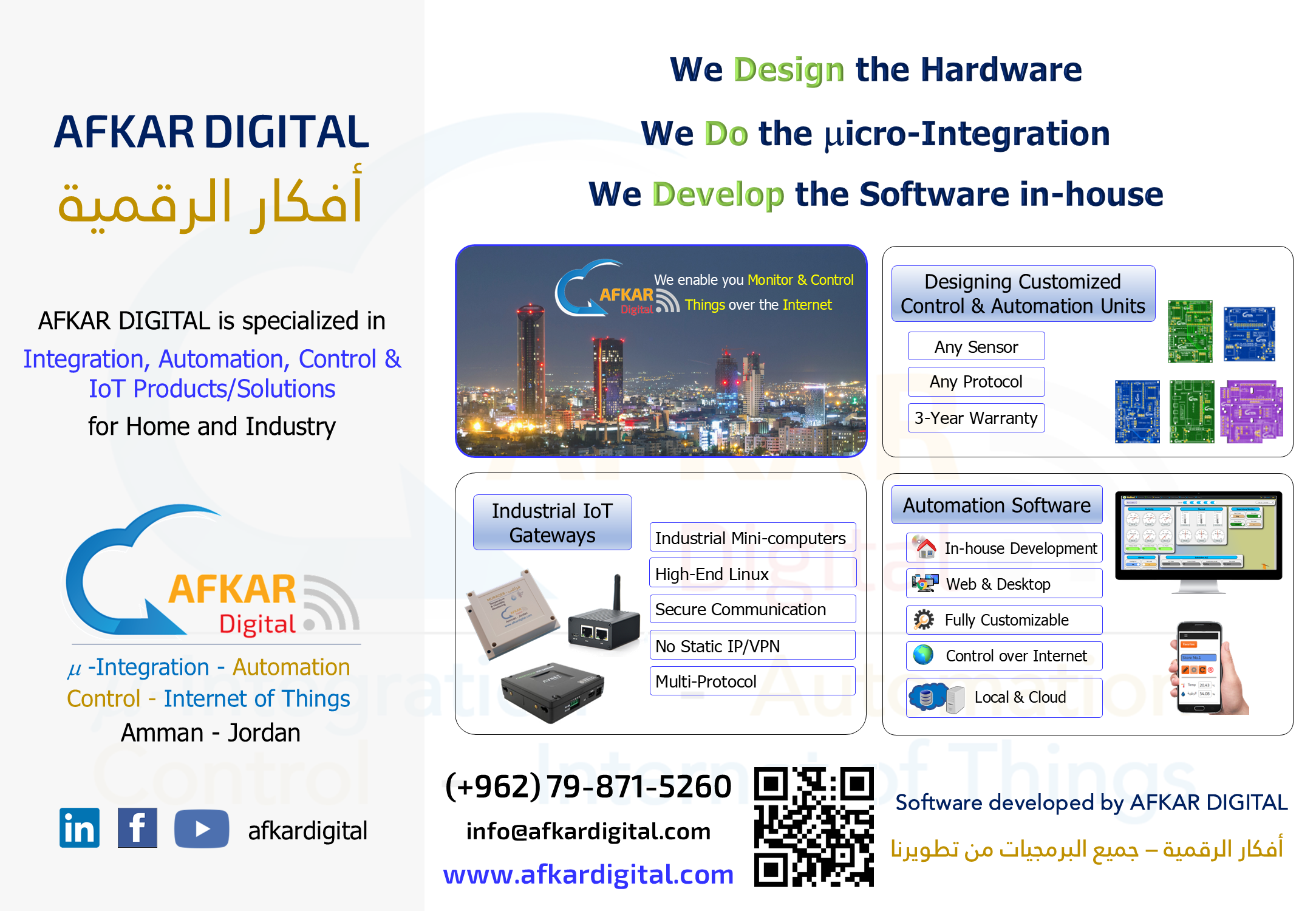 Additionally, AFKAR DIGITAL has developed its own Control and Automation Platform called HudHud, which is widely used by customers in Jordan and internationally. Our clients rely on the HudHud platform to monitor hundreds of control units designed and manufactured by AFKAR DIGITAL.
