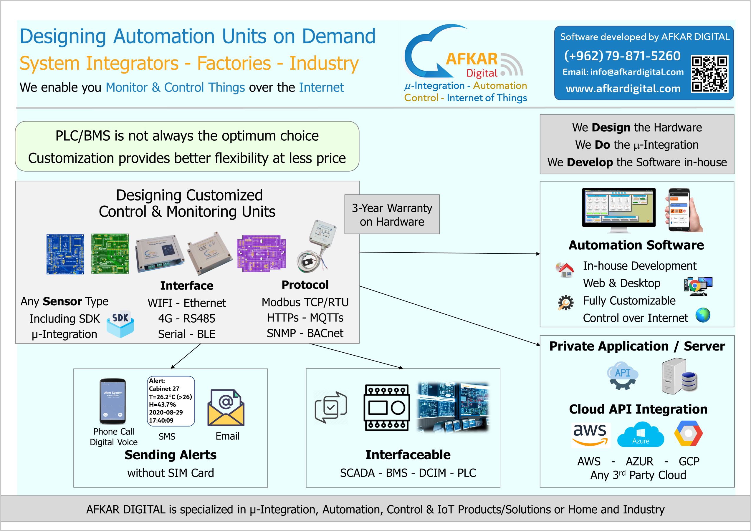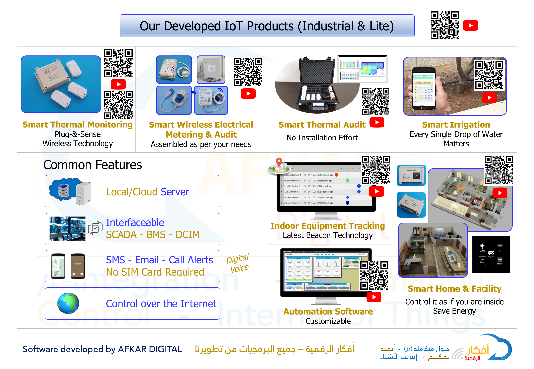 AFKAR DIGITAL can enable monitoring and control of any device or "thing" via your mobile or PC, supporting a wide range of applications such as temperature mapping, smart irrigation (by time, period, or volume), remote control of equipment like motors and pumps, machine and production line monitoring, malfunction alerts, energy and resource online monitoring (electricity, water), IP camera integration, and more.